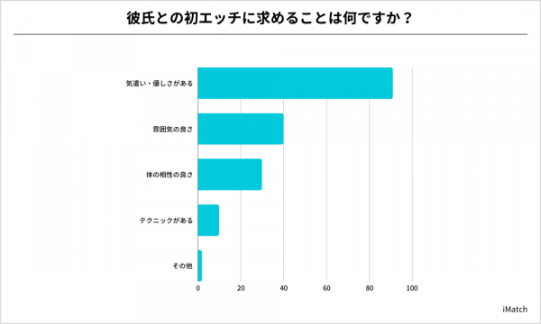 また、初エッチでは体の相性やテクニック以上に、気遣いや優しさを求めていることも分かりました。男性は思いやりのある初エッチを意識すると印象がよいでしょう。