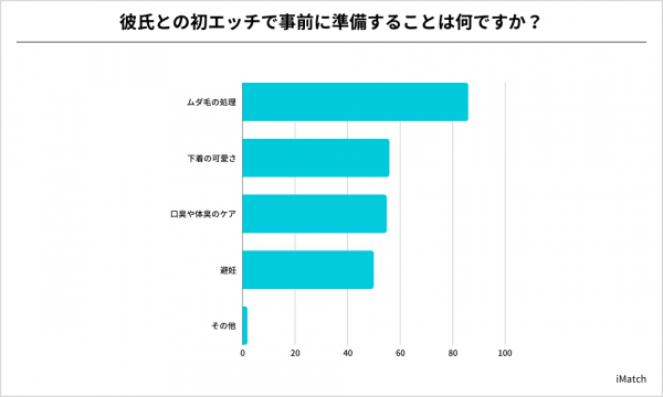 初エッチで事前に準備することの1位は、「ムダ毛の処理」となりました。女性は身だしなみに対する意識が高いため、男性も最低限のケアはしておきましょう。