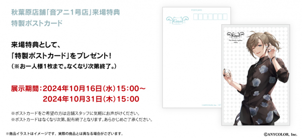 また、弊社秋葉原店舗「音アニ」では10月16日(水)15:00より「A4クリアファイル」および「ワイヤレス充電器」の販売と同時に実機展示を実施いたします。本モデルに搭載される録り下ろしボイスや音質を確認できるほか、店頭設置の専用QRコードからもご購入いただけます。ご来店特典として、オリジナルポストカードの配布をさせていただきます。ただし、数量に上限があり、配布はお一人様1日1枚まで、なくなり次第終了となります。