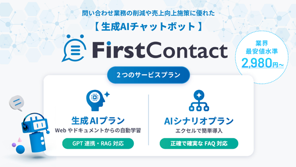 『FirstContact』はコストパフォーマンスに優れた生成AIチャットボット。シナリオ型と生成AIをハイブリット利用でき、成果と費用のバランスに優れた製品です。