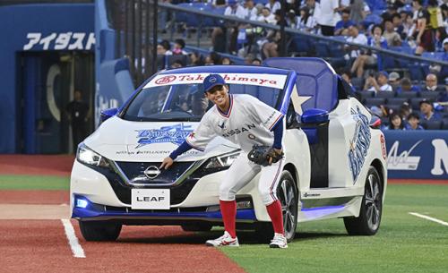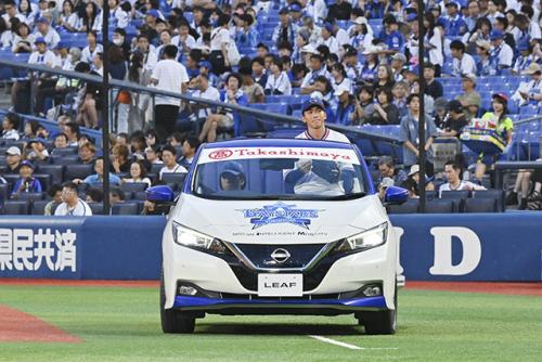 日産自動車硬式野球部 石毛大地は、日産 電気自動車「リーフ」リリーフカーでグラウンドに登場。