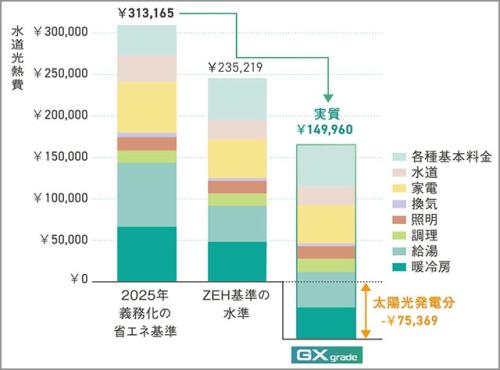 ポラス「GX grade」は、ハイブリッド給湯器による給湯費用の削減や、太陽光パネルによって、ZEH水準の住宅と比較し、年間8万5,259円(うち太陽光発電分7万5,369円)の水道光熱費を削減できることを試算・確認済み。