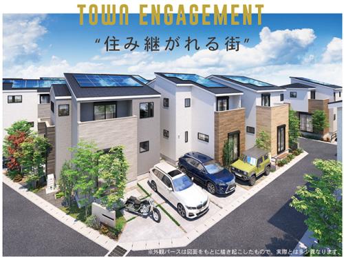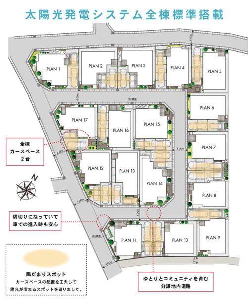 太陽光発電システム全棟標準搭載、駐車スペース全棟2台分。