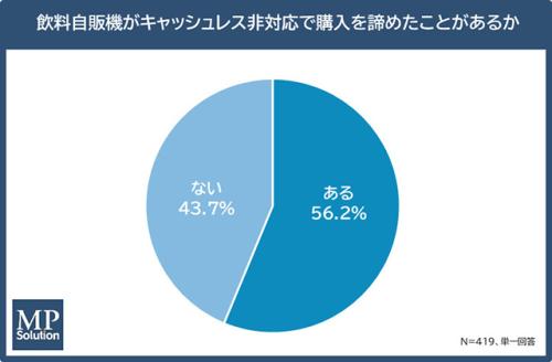 そのうち、飲料自販機がキャッシュレス非対応で購入を諦めたことがある人は50%以上にのぼり、キャッシュレス決済の対応有無が販売機会に大きく影響している。