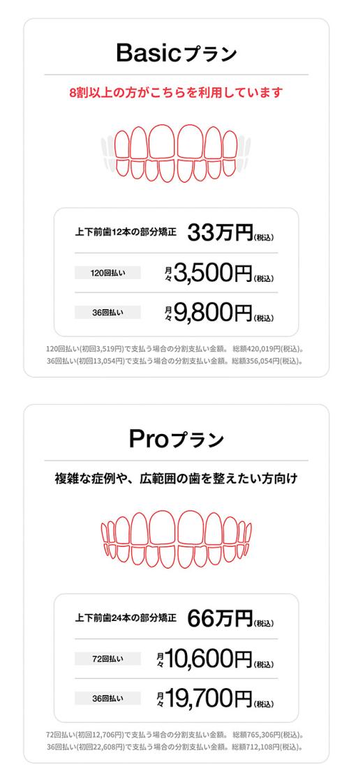 矯正プランは、前歯のズレを整える「部分矯正(Basicプラン)」と、上下24本を対象とした「広範囲矯正(Proプラン)」。