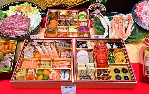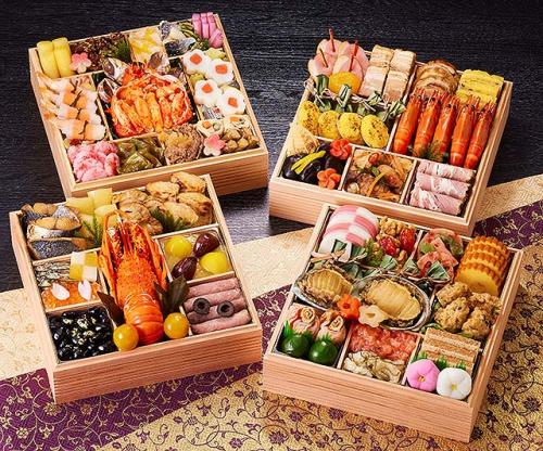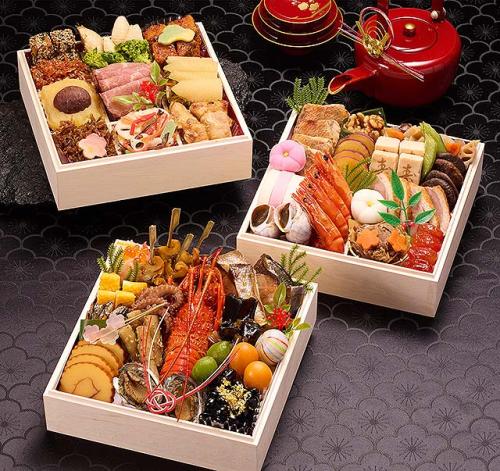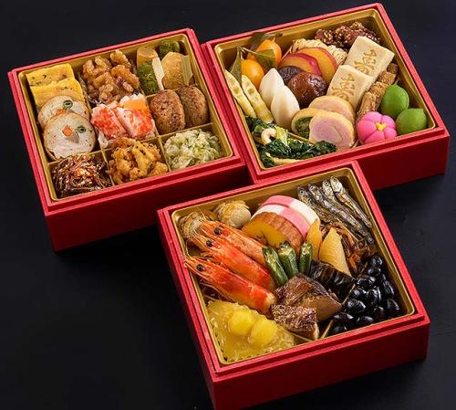 内容 : 和の重は、伝統的なおせち食材と、こはだかぶら和えや柔らかく炊き上げた白花豆煮。洋の重は、十勝ハーブ牛ローストビーフやロブスター。中華の重は、豚を黒糖で仕上げたローストポークと鮑煮が入った豪華なお重となっております。