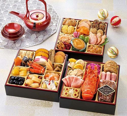 内容 : おせちの定番献立とロブスターを1尾盛り込んだ、お得で華やかな三段重おせちです。とくに、江口大将こだわりの逸品、ちりめん山椒をご賞味ください。
