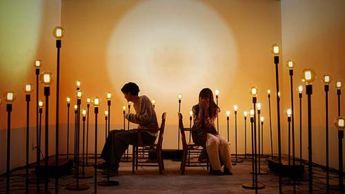 クライマックスでは、男性の真のパートナーである女性が背後の椅子に座り、二人が手をつなぐと、鼓動と光がゆっくりシンクロしはじめる。