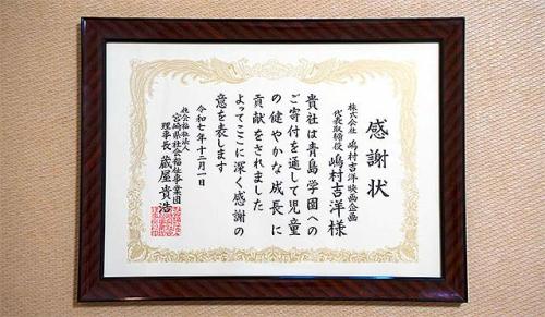 嶋村吉洋映画企画(大阪府大阪市)嶋村吉洋 代表取締役社長は、12月1日、宮崎県の児童養護施設、青島学園から感謝状を受け取った。
