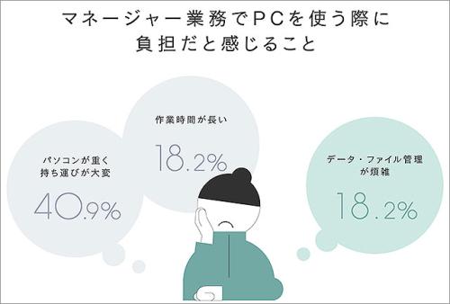 マネージャー業務におけるデジタル業務ついての負担を聞くと、1位は「パソコンが重く持ち運びが大変」(40.9%)。