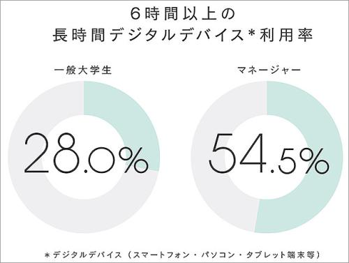 6時間以上デジタルデバイスを利用する一般大学生は28%で、マネージャーは54.5%と過半数に達し、長時間利用者の割合は約2倍だった。