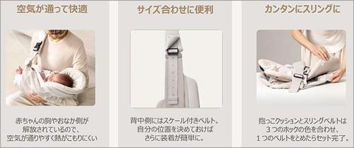 おうちでの長めの抱っこのほか、1カ月検診などのお出かけには、「抱っこクッション」+「スリングベルト」のスタイルがおすすめ。