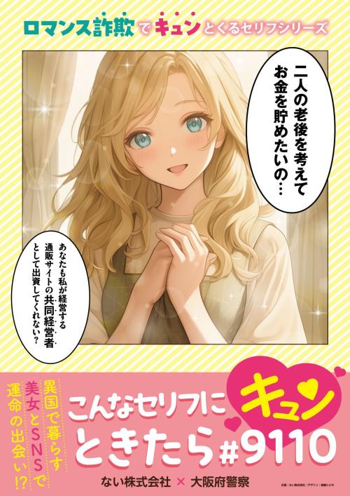 株式会社タップル(本社:東京都渋谷区、代表取締役社長:平松繁和)は、2025年10月1日より大阪府警察と連携したSNS型ロマンス詐欺被害防止の啓発活動を開始しました。今回の取り組みは、アプリ内での注意喚起記事配信と、コミック風の公式ポスター掲出を中心に展開され、府内に居住登録のある利用者に向けて被害予防を強化します。プランナーの岡シャニカマ氏(ない株式会社)が企画・制作した「キュンとくるセリフ」シリーズは、ロマンチックに聞こえる言葉が詐欺の手口であることを視覚的に示す構成です。