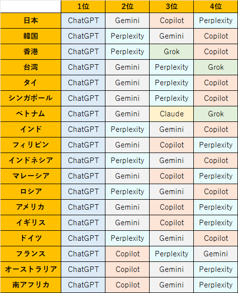 一方でGoogleのGeminiは、日本や東南アジア、米国など9カ国・地域で検索ボリューム2位に躍進しました。2025年5月のGoogle I/Oでの新モデル「Veo 3」や検索へのAI統合「AIモード」のグローバル展開が背景にあり、検索基盤を握るプラットフォーマーの影響力がユーザー接点に直結していることが読み取れます。マーケティングやSEO、顧客接点設計では、こうしたプラットフォーム動向を前提に施策を検討する必要があります。