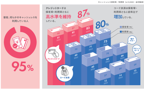 株式会社ジェーシービー(JCB)は、2024年度版「キャッシュレスに関する総合調査」を実施し、その結果を発表しました。本調査は2000年以降毎年行われており、今回は全国の20〜60代の一般消費者3,500名を対象に、2024年9月17日から30日にかけてWEB調査で実施されました。結果として、キャッシュレスを普段利用している人の割合は95%に達しており、国内におけるキャッシュレス浸透が高水準であることが示されました。とくにクレジットカードの保有率は87%、利用率は83%と依然高い水準を維持している点が注目されます。これらの数値は、決済手段の多様化が進む中でもクレジットカードが依然として主要な支払い手段であることを裏付けています。