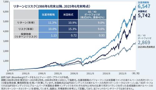 [5] 出所:S&P、Bloombergのデータをもとにティー・ロウ・プライスが作成。期間:1986年6月末(設定日)~2025年6月末。当運用戦略のパフォーマンスは米国籍ファンドの米ドルベースの月次リターン(分配金再投資、費用控除後)を用いて計算しています。