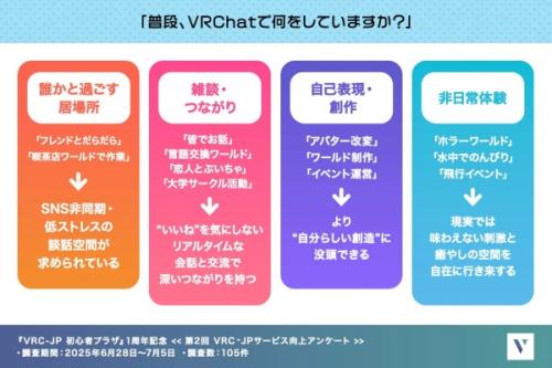 株式会社Vは、2025年6月28日から7月5日にかけて、1周年記念として「第2回 VRC-JPサービス向上アンケート」を実施しました(回答数105件)。