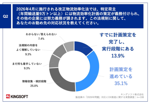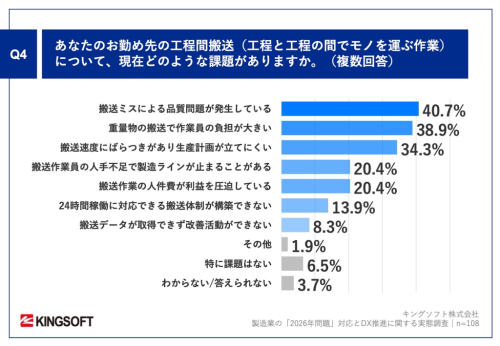 キングソフト株式会社(本社:東京都港区、代表取締役会長兼社長:馮 達、以下、キングソフト)は、製造業(企業規模:資本金3億円未満、従業員数300名以下)に勤めており、自社の工場内物流業務に携わっている方108名を対象に、製造業の「2026年問題」対応とDX推進に関する実態調査を実施しましたので、お知らせいたします。