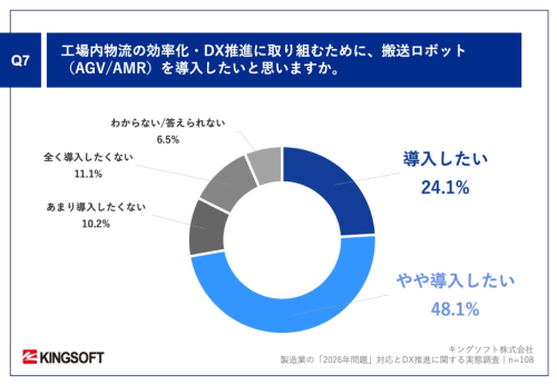 「Q7.工場内物流の効率化・DX推進に取り組むために、搬送ロボット(AGV/AMR)を導入したいと思いますか。」(n=108)と質問したところ、「導入したい」が24.1%、「やや導入したい」が48.1%という回答となりました。