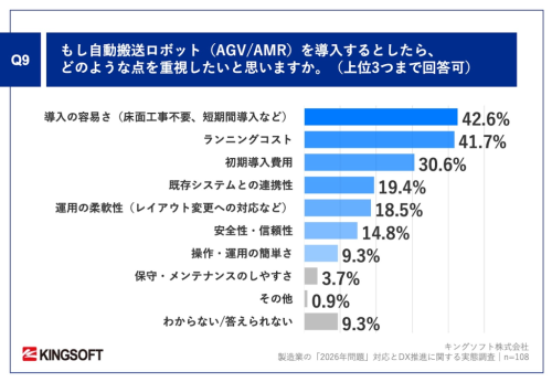 「Q9.もし自動搬送ロボット(AGV/AMR)を導入するとしたら、どのような点を重視したいと思いますか。(上位3つまで回答可)」(n=108)と質問したところ、「導入の容易さ(床面工事不要、短期間導入など)」が42.6%、「ランニングコスト」が41.7%、「初期導入費用」が30.6%という回答となりました。