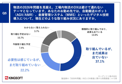 「Q5.物流の2026年問題を見据え、工場内物流のDXは避けて通れないテーマとなっています。あなたのお勤め先では、自動搬送ロボット(AGV/AMR)、倉庫管理システム(WMS)といったデジタル技術導入について、現在どのような取り組み状況にありますか。」(n=108)と質問したところ、「取り組んでいるが、まだ成果は出ていない」が37.1%、「必要性は感じているが、まだ取り組めていない」が22.2%という回答となりました。