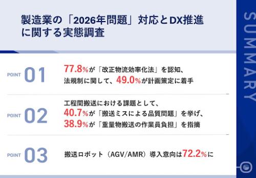 まず、2026年4月施行の「改正物流効率化法」について77.8%が認知しており、49.0%が計画策定を完了または進行中であることが分かりました。また、工程間搬送においては、40.7%が搬送ミスによる品質問題、38.9%が重量物搬送による作業員負担を課題として挙げています。具体的な効率化ニーズとしては、「製造ライン内での物の移動」が最も多く44.4%、次いで「工程間の搬送・運搬作業」が26.9%、「仕掛品の管理・移動」が25.0%と上位を占めました。デジタル技術導入については、51.0%が取り組んでいるものの、成果を出している企業は13.9%に留まり、未着手と回答した方の56.2%が「どこから始めればよいかわからない」ことを理由に挙げました。最後に、搬送ロボット(AGV/AMR)の導入意向は72.2%と高く、74.1%がAGVとAMRの違いを理解していることが分かりました。