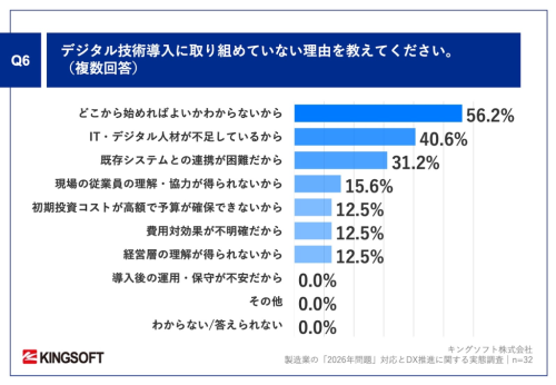 Q5で「必要性は感じているが、まだ取り組めていない」「今後取り組む予定」と回答した方に、「Q6.デジタル技術導入に取り組めていない理由を教えてください。(複数回答)」(n=32)と質問したところ、「どこから始めればよいかわからないから」が56.2%、「IT・デジタル人材が不足しているから」が40.6%、「既存システムとの連携が困難だから」が31.2%という回答となりました。