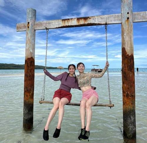 添付された写真の中では、透明度の高い海に設置された大きなブランコに並んで座り、満面の笑みを浮かべる堀田と朝日の姿が印象的だ。