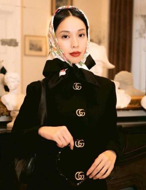 投稿では、黒のグッチコートにスカーフを頭に巻いた洗練されたスタイリングを披露。