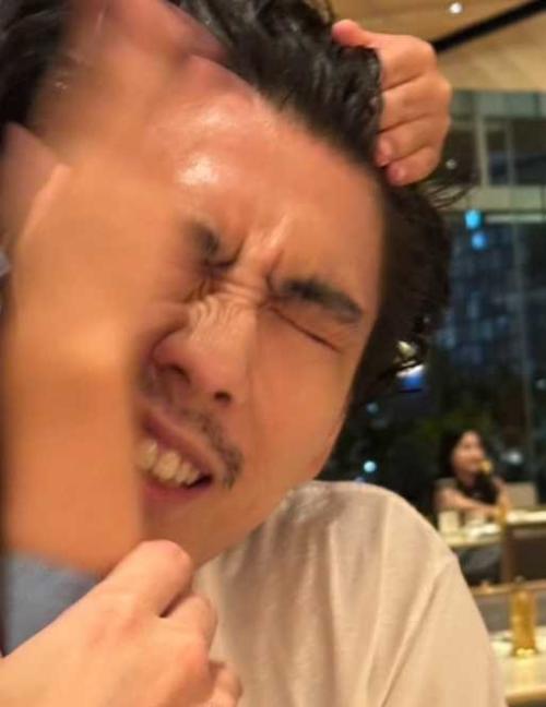 公開された写真には、子どもの手で顔を押さえつけられ、思わず顔をしかめる賀来の姿が映し出されている。