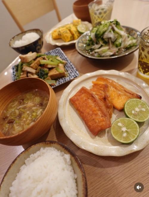 食卓には、厚揚げと小松菜のナムル、鮭のハラス焼き、カブときゅうりとミョウガの浅漬け、ネギ入りのだし巻き卵、そしてネバネバ食材を使った味噌汁が並んだ。