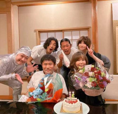 写真では、小川が花束を手に、浜田を中心に芸能界の仲間たちと並び、ケーキを囲む姿が印象的だ。