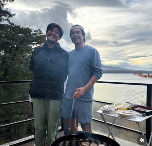 片方の人物がトングを手に笑顔を見せ、もう一方の人物が肩に手を回して寄り添うように並び、リラックスした空気感と長年の友情がにじみ出る印象的な一枚となっている。