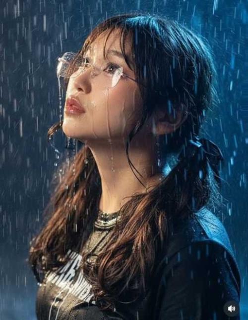 公開された写真では、雨の中で空を見上げるりんごちゃんの横顔が捉えられている。髪は濡れて頬に張り付き、メイクは最小限に抑えられ、透明感のある素肌と儚げな表情が際立つ。クリアフレームのメガネには雨粒が光り、背景のブルーのライティングと相まって、まるでミュージックビデオのワンシーンのような幻想的な雰囲気が漂う。普段のコミカルな印象とは一線を画す、静かで繊細な美しさを放つ一枚だ。