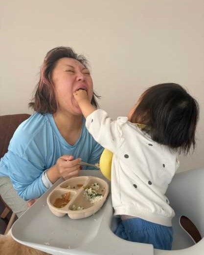 添えられた写真には、食卓でバービーが娘と向かい合いながら食事をしている姿が写っている。娘が小さな手でバービーの口に食べ物を押し込む瞬間をとらえたもので、バービーは少し苦しそうな表情をしながらも、どこかうれしそうな様子を見せている。