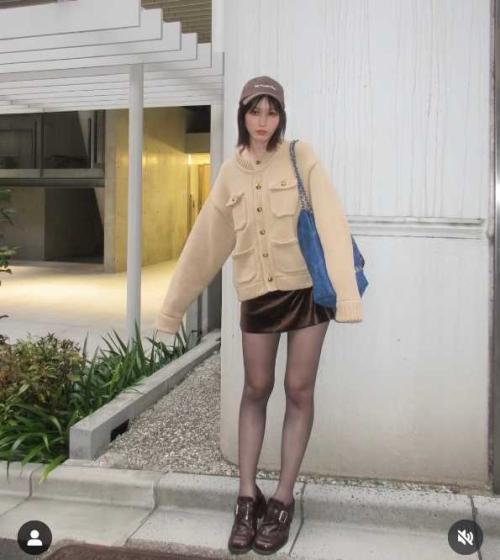 今回の投稿で本田は、ベージュの厚手カーディガンにブラウンのミニスカートを合わせ、ブラウンのキャップをかぶった上品でカジュアルな秋コーデを披露。