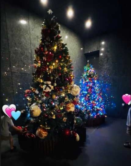 写真には、きらびやかなライトに包まれた2本のクリスマスツリーが並び、壁一面を照らす幻想的な光景が広がっている。