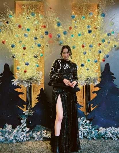 投稿された写真では、河北が大胆なスリットが入った黒のロングドレスをまとい、きらびやかなイルミネーションツリーの前に立っている。