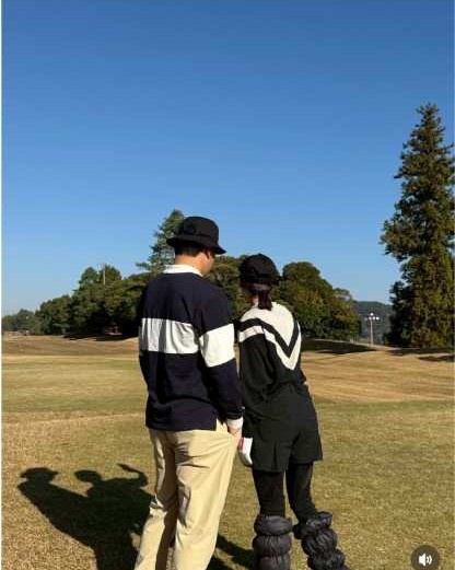 公開された写真には、広々としたゴルフ場の青空の下、並んで立つ里田と田中の後ろ姿が捉えられている。