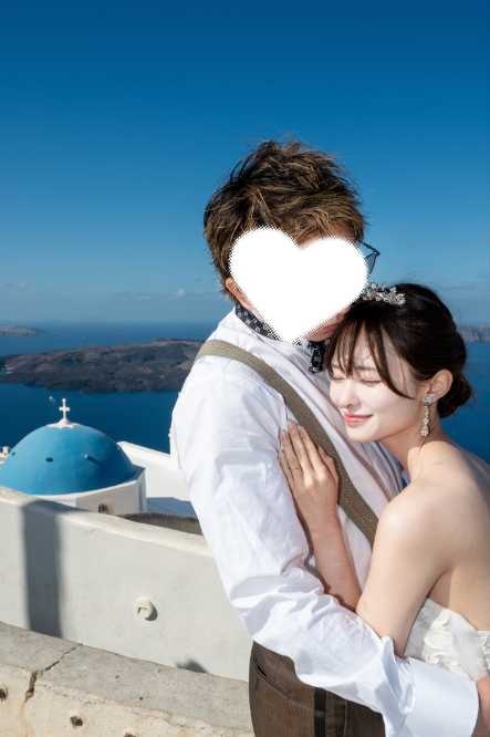 白い壁と青い屋根が印象的な建造物を背に、ウエディングドレス姿の藤咲が穏やかな笑顔で新郎の胸に頬を寄せる様子は、幸せに満ちた一瞬を捉えたもの。