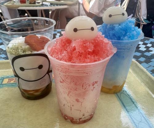 ベイマックスのおまんじゅうがかわいいシェイブアイス。ストロベリー、ブルーシロップ&マンゴーの2種類をいただきました。細長カップで食べ歩きにもぴったり。身体の中から美味しく冷やしてくれます。
