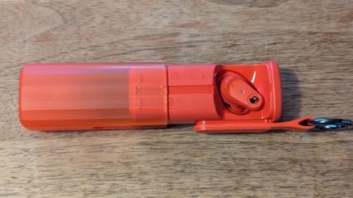 カラビナでぶら下げてスタイリッシュに持ち運べるスライドケースが付属します。ぶら下げたまま引き出すと左手側に左耳、右手側に右耳のイヤホンが出て来るので、左右間違えることなく装着、収納ができます。