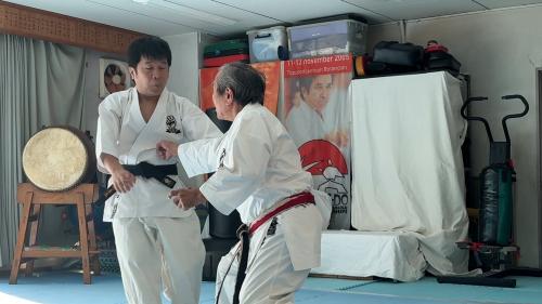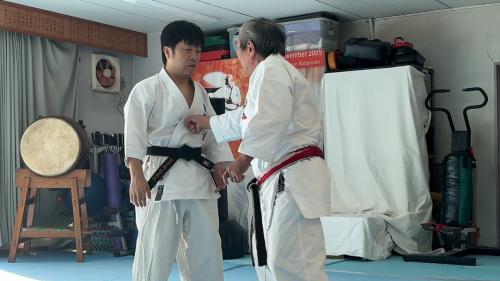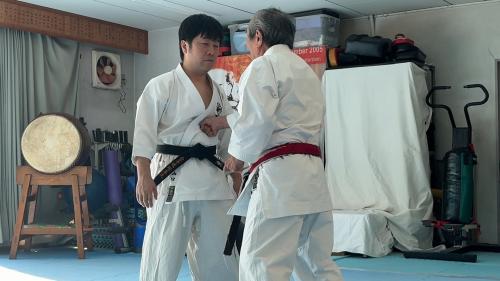 道衣に着替えて、山口会長から剛柔流の一部を教えていただきます。