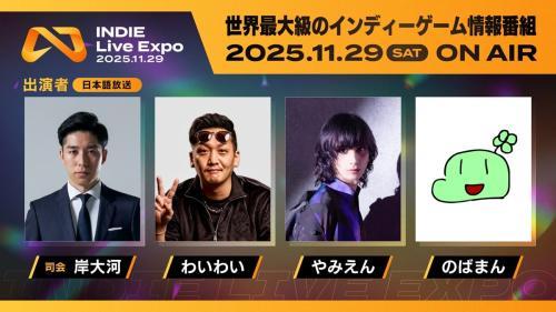 「ゲームへの貢献」をテーマにインディーゲーム情報を発信し、これまで累計3000タイトル以上を紹介、全世界で累計1億を超える視聴回数を獲得してきたライブ配信番組「INDIE Live Expo」。その次回開催が2025年11月29日(日)の「INDIE Live Expo 2025.11.29」に決定し、紹介タイトルの募集を開始しました。