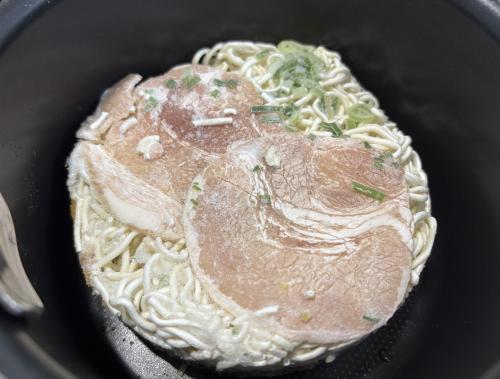 このシリーズはスープと麺と具材が一体になっていて、お鍋で温めれば完成だ。まずは弱火で30秒、その後強火で5分20秒、麺をほぐしたら仕上げに10秒煮立てたら出来上がり。