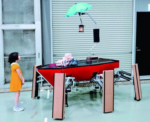 人の旅に寄り添う大型6脚ロボット。機械学習などとの連携により人とのインタラクションを行う。全長約2.5メートル、重量約50キロ。