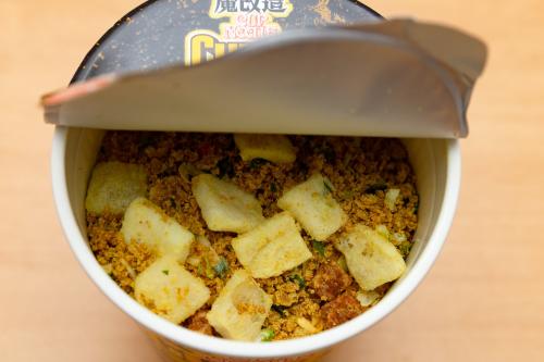 具材を見たところ、謎肉やニラのあたりが目立つところ。お湯を注いで完成した一口目をすすると……うまい。まずはニンニクが口の中に香りますが、よくよく味わうと、ベースはしっかりとカップヌードルの、あの美味しさ。そこに、ニラやニンニク、動物性の脂の旨味が加わり、後味のピリ辛がアクセントとして響いてきます。