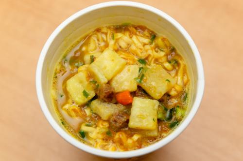 「カップヌードル カレー」のスープをベースに、ガーリックの香ばしさとマヨネーズの風味を加えた “ガリマヨカレー味”のスープ。
