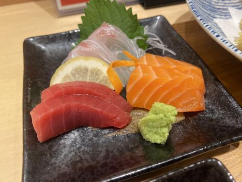 ▲お刺身は3種盛り。まぐろとサーモンのとろける食感が贅沢。天ぷらとお刺身を同時に味わうというのは、家庭ではなかなかできないので、近場に住んでいたらこのために来たいレベル。