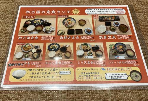 ▲ランチメニュー。筆者は1番人気の「和乃国定食」をチョイス。お味噌汁はあら汁に変更(+250円)しました。